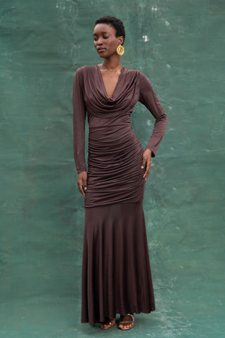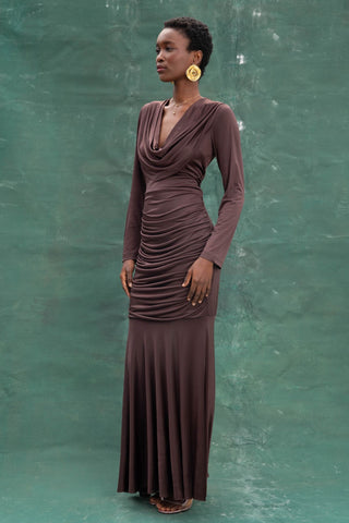 Refined yet sensual, the Riley Dress offers long sleeves, a plunging neckline and flattering ruched detail at the waist. Crafted in a luxe brown jersey, its full-length silhouette is made to move with elegance and ease, making it perfect for elevated evenings.