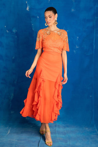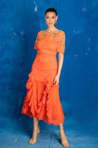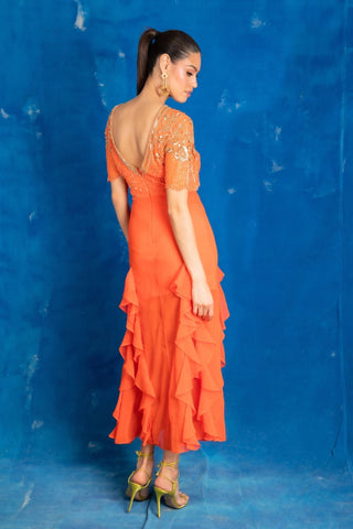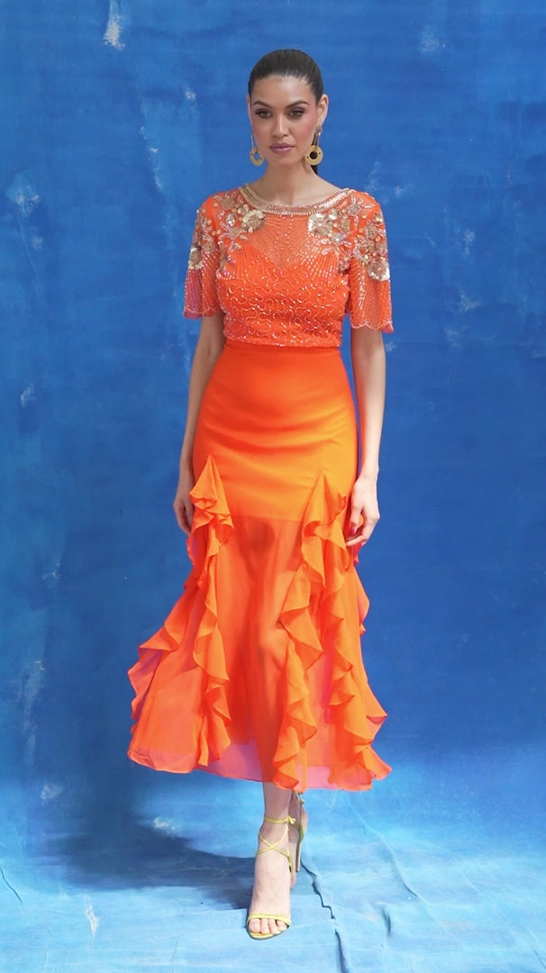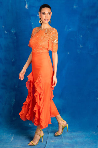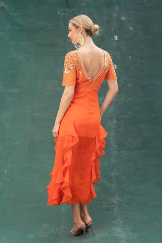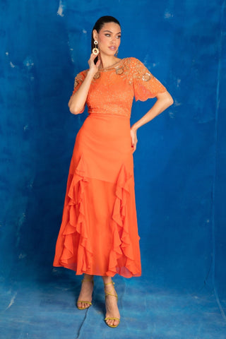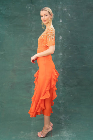 A classic reinvented - brighten your wardrobe with the AslI Dress. This tangerine-toned number is fitted at the bodice with a frilled hem - just the right balance of playful and polished.